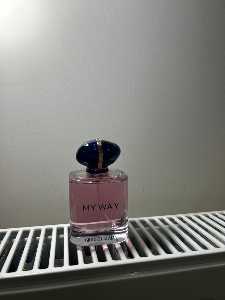 Giorgio Armani My Way kadın parfümü, koyu mavi kapaklı şeffaf şişede pembe sıvı içerir ve ferah, zarif bir koku sunar.