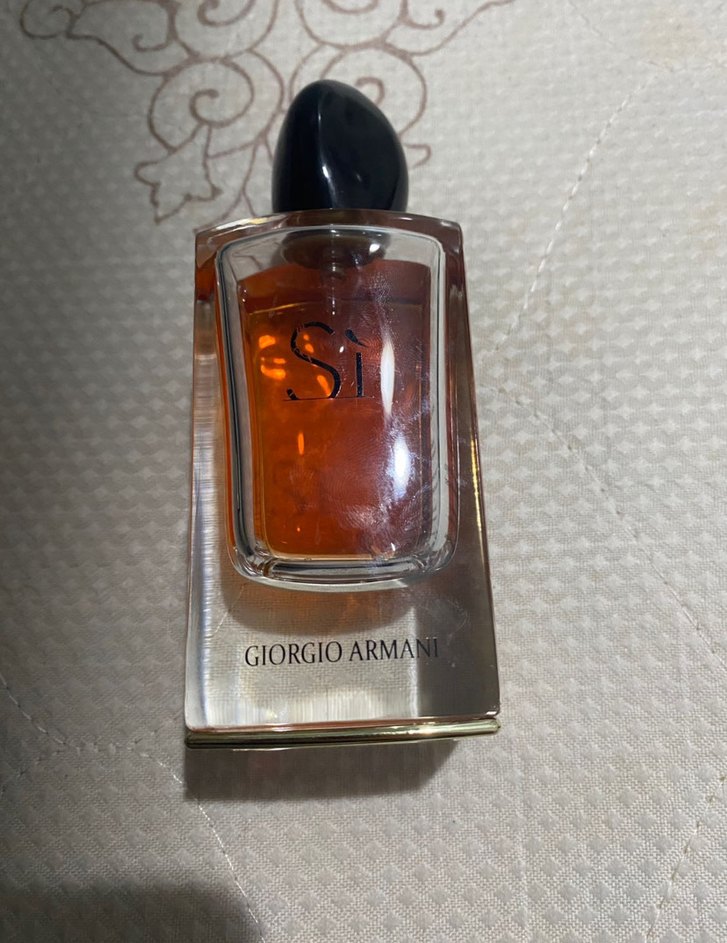Giorgio Armani Si kadın parfümü, siyah kapaklı şeffaf cam şişede zengin amber renkli kokusuyla sunuluyor. Markanın adı ön tarafta yer alıyor. Orijinal