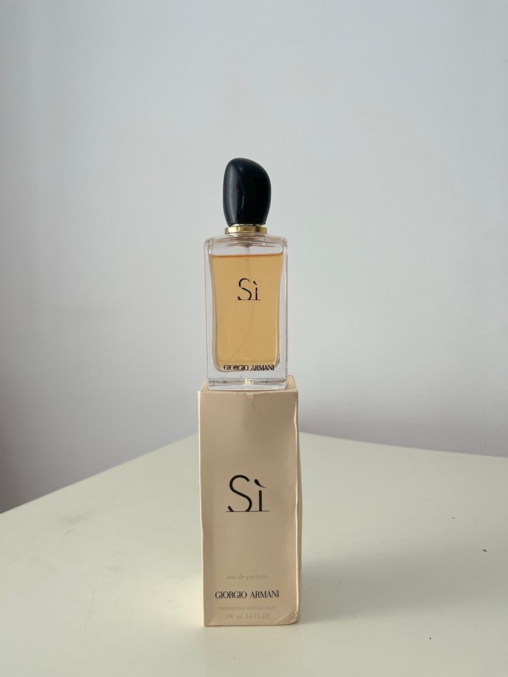 Giorgio Armani Si kadın parfümü, siyah kapaklı şeffaf şişede, yumuşak ve zarif bir kokuya sahip. Ambalajı bej renkte ve Si logosu bulunuyor.