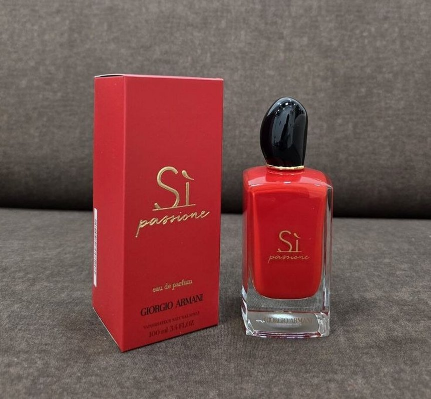 Giorgio Armani Si Passione kadın parfümü, 100 ml kırmızı şişede, siyah kapaklıdır. Tutkulu ve zarif bir koku sunar.