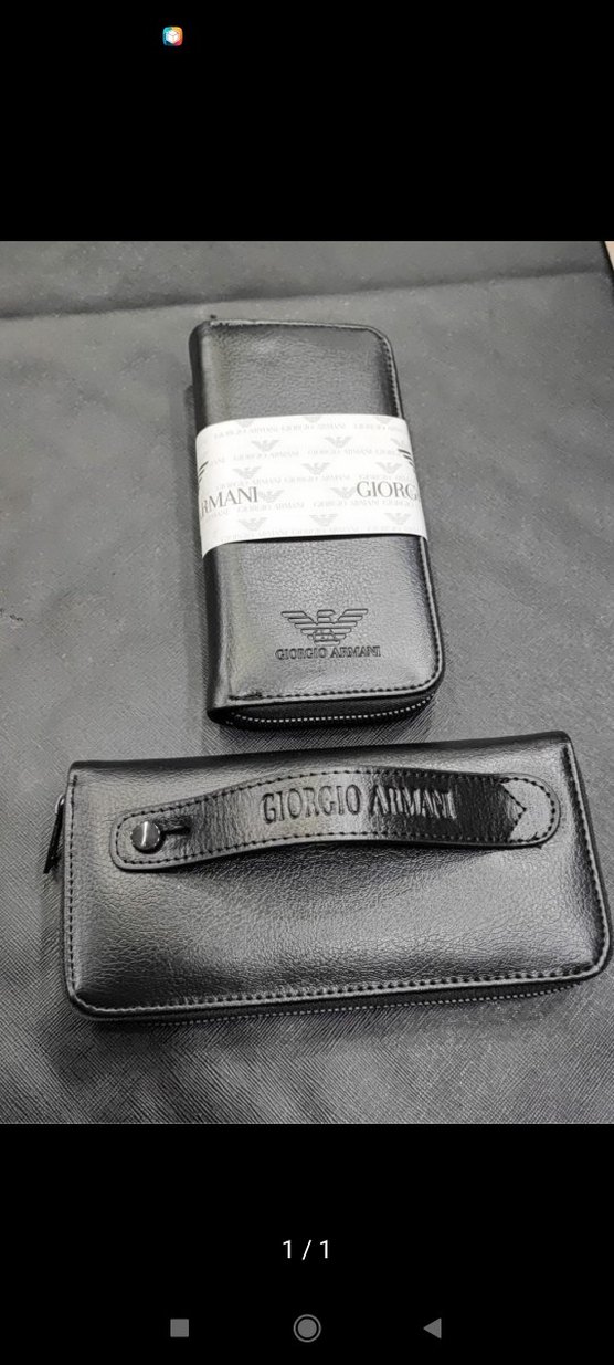 Siyah erkek cüzdanı, baskılı desene ve fermuarlı kapamaya sahip modern klasik tasarım sunar. Giorgio Armani marka kabartmalı sapı bulunur.