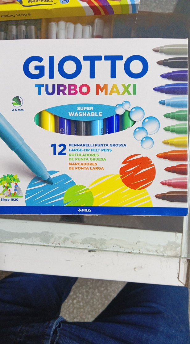 Giotto Turbo Maxi, 12 renk kalın uçlu, süper yıkanabilir keçeli kalemler sunar. 5 mm uçlarıyla canlı ve belirgin çizgiler oluşturur.