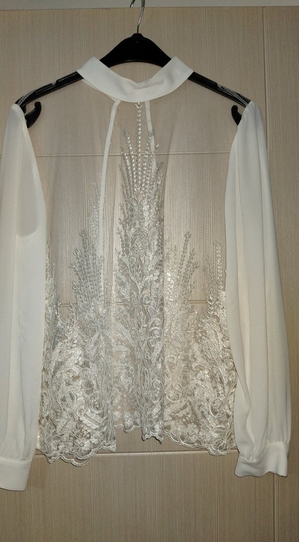 Boğaz ve kolları krep kumaş.Ense kısmından 4 düğmeli ve sırtı açik. özel gün için kullanıma uygun şık bir bluz. içine aynı renk askılı bluz giyerek kızımın bebek mevlidinde giymiştim. sadece 1 kez giyildi. kolları tülermiş fakat ufak bir tadilat ile kullanıma uygun olur.