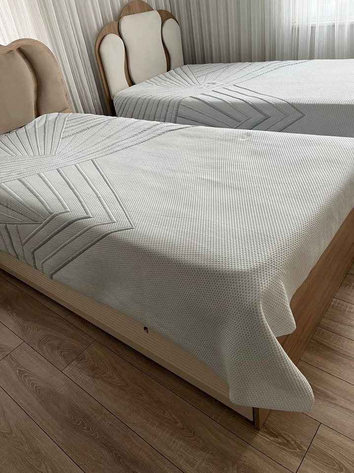 Gri kabartmalı desenlere sahip beyaz yatak örtüsü, temiz ve şık bir görünüm sunar. Dokulu yüzeyiyle yatağı düzgünce kaplar. ️
