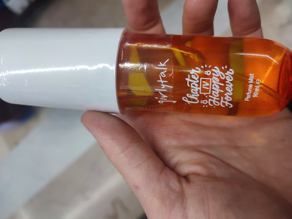 Girl Talk Heart & Happy kadın parfümü, beyaz kapaklı küçük şişede, içinde sıcak kehribar renkli sıvı bulunuyor.