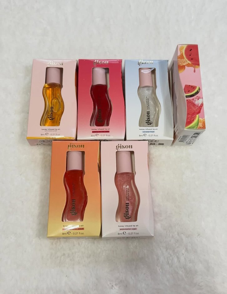 Gison markalı pastel tonlarda, canlı renklerde parlak dudak parlatıcıları seti. Her biri dudaklara parlaklık verir.