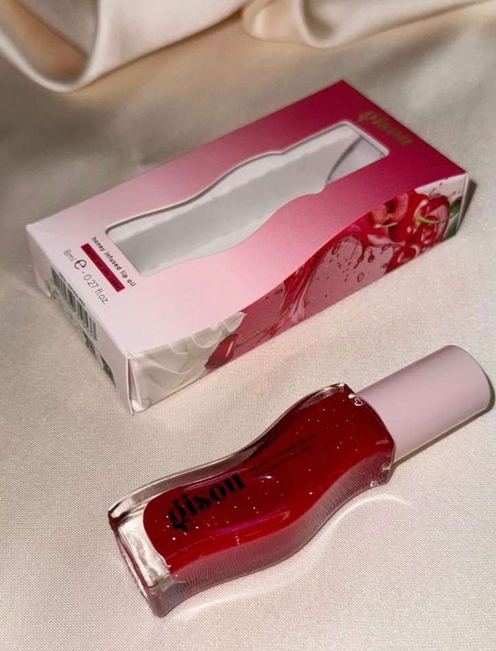 Parlak kırmızı renkte, beyaz kapaklı, şeffaf ve kıvrımlı şişede dudak parlatıcısı. Pembe-beyaz kutuda paketlenmiş.