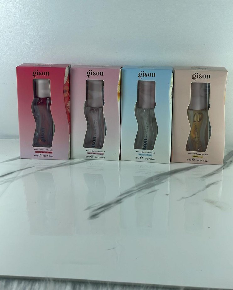 Gisou dudak parlatıcıları, gri dahil çok renkli ve canlı seçeneklerle sunulur. Her biri şık kutuda paketlenmiştir.