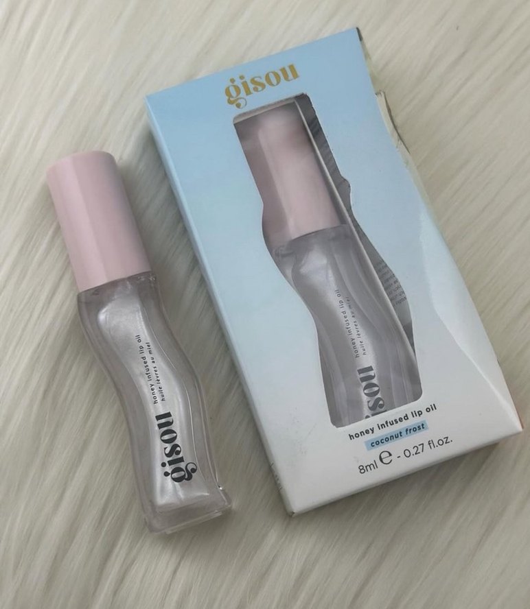 Gisou markasına ait, hindistancevizi aromalı bal ile zenginleştirilmiş beyaz pastel dudak yağı. 8 ml hacminde.