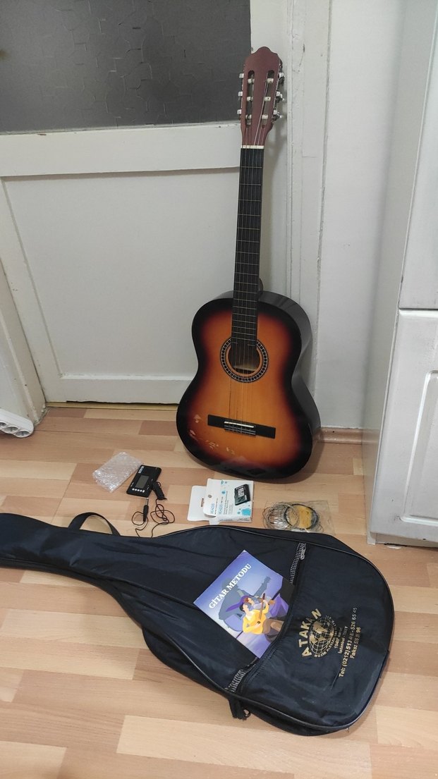 Gitar, elektrikli aparatı akort için, gitar kitabı kılıfı 4 parça birlikte veriyorum, önü çizik ama sağlam telleri değişip akort edilmeli. Arenas marka içinde yazısı mevcut