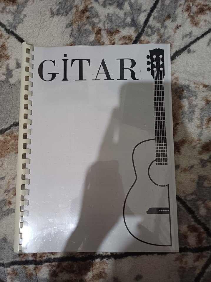 Beyaz kapaklı, üzerinde gri gitar çizimi bulunan gitar öğrenme kitabı. Üstünde "GITAR" yazısı yer alıyor. içerisinde çoğu şarkının notaları yer alır. müzik hocasının önerisiyle alınmıştır.