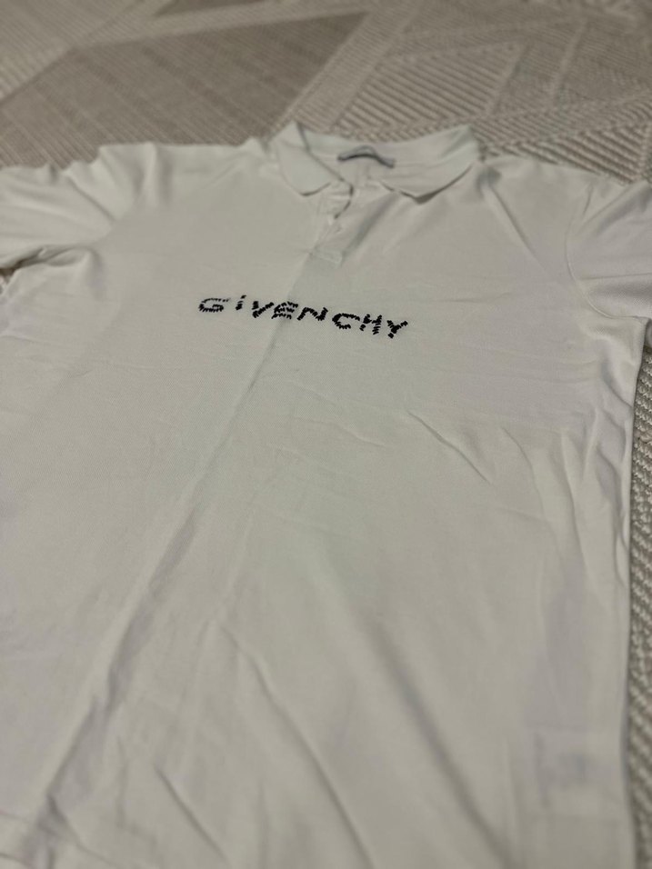 Givenchy beyaz erkek polo tişört, düğmeli yakası, kısa kollu ve vücuda oturan kesime sahip. Yumuşak keten kumaştan üretilmiş, baskılı logo içerir, günlük kullanım için uygundur.