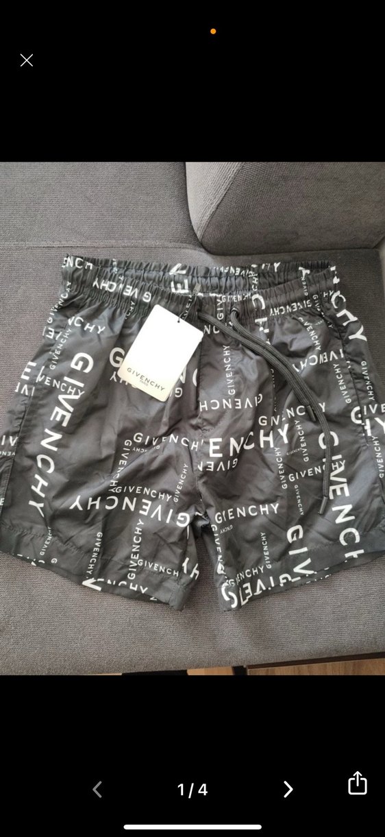 Gri renkte, elastik bel bantlı ve Givenchy logosu baskılı, fit kesim erkek mini şort, plaj için uygundur.