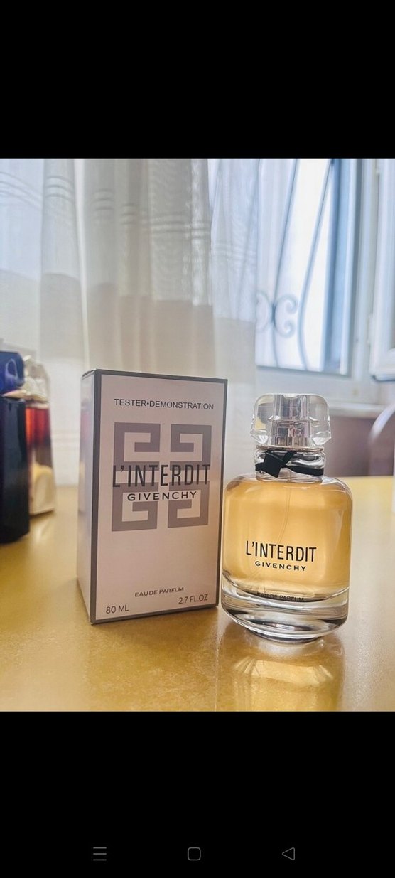Givenchy L'Interdit kadın parfümü, Şeffaf şişede siyah fiyonk detayıyla sunulan eau de parfum.