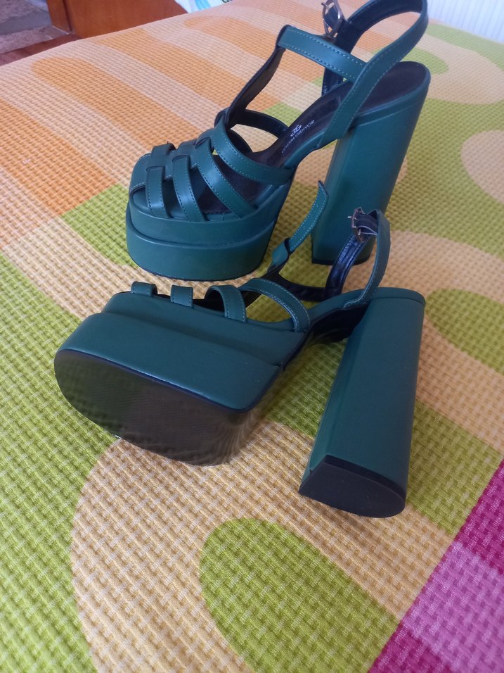 Koyu yeşil renkli, kalın kauçuk tabanlı platform topuklu, tokalı kayışlarla bohem ve retro tarzda parti ayakkabısı. Hiç Kullanılmadı