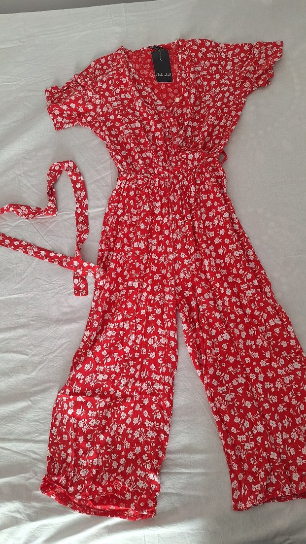 yazlık Kadın tulumu, bol kesim ve uzun boydur. V yaka, kırmızı çiçekli desene sahiptir. Bohem tarz için uygundur.