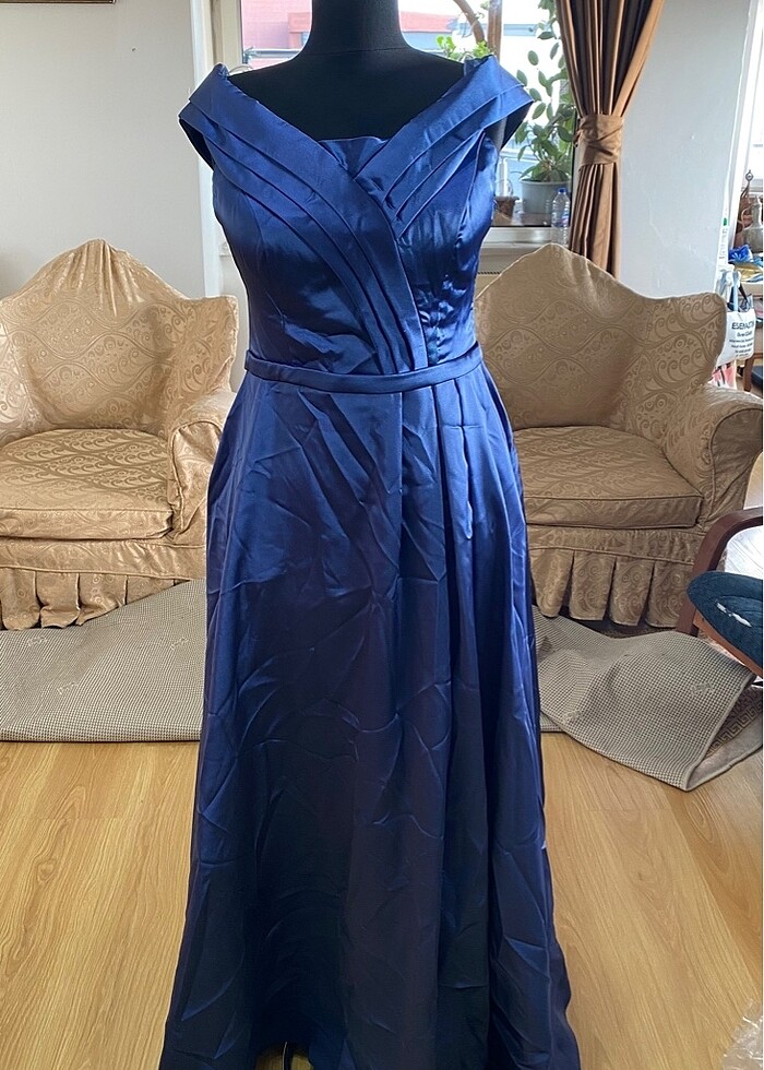 Mavi saten elbise kırış kırıştır Fotoğrafta kusuru belirti arka tarafta tiftik olmuş yerler var ama çok belli oluyor ön tarafta bir iki ip çekilmesi var ama dikkatli bakılımca belli oluyor Boy 145 cm Bel 75