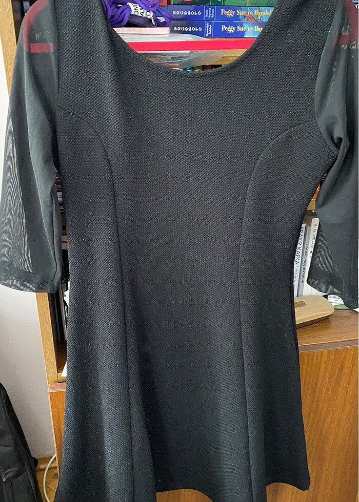 Elbise siyah ama simli gibi iki ip kullanılmış biri siyah biraz parlak kumaş ya da ipten Elbisenin uzunluğu 88 cm Göğüs ölçüsü 87 cm Bel 77