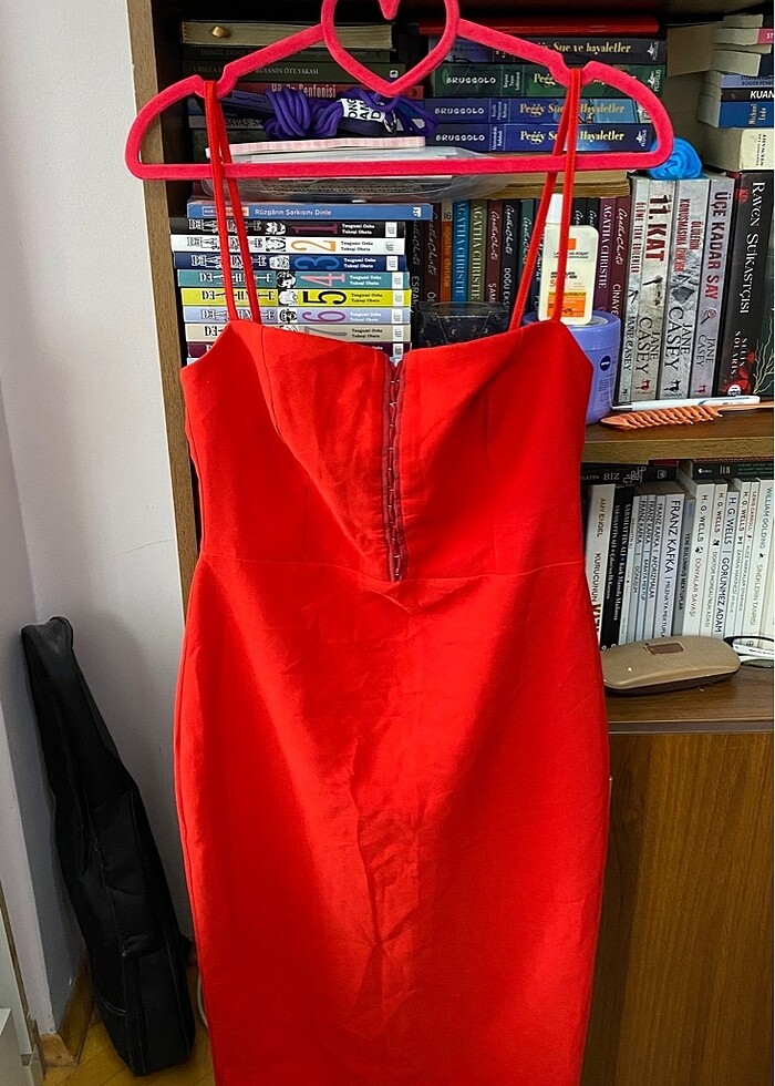 Rengi fotoğrafta turuncu gibi gözüküyor ama aslında kırmızı am çok koyu değil Omuzdan boyu 113 cm Göğüs 75 cm Bel 76 cm