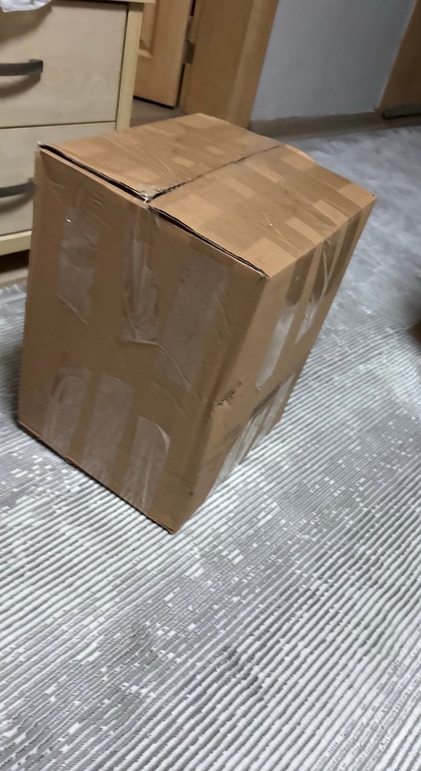 Kahverengi kartondan yapılmış, bantla kapatılmış kutu, gri dokulu zeminde duruyor.