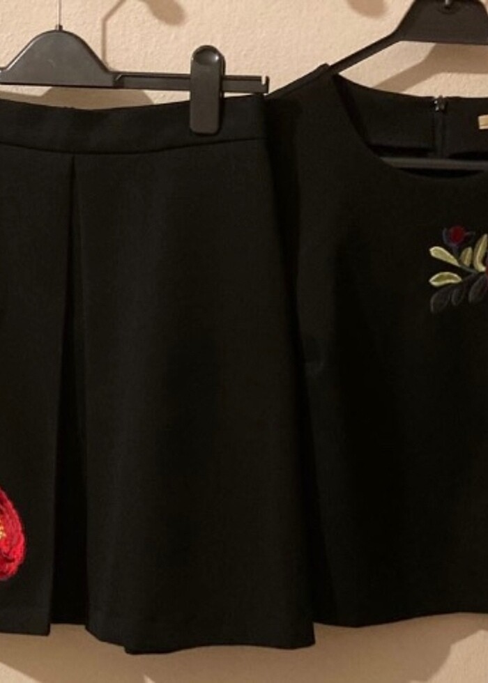 Sadece bir defa nikahta giyilmiştir. Kusursuzdur. 34/36 beden uyumludur. Bluz, iki kol arası: 44 cm, boy: 50cm. Etek, bel: 36 cm, boy: 50 cm.
