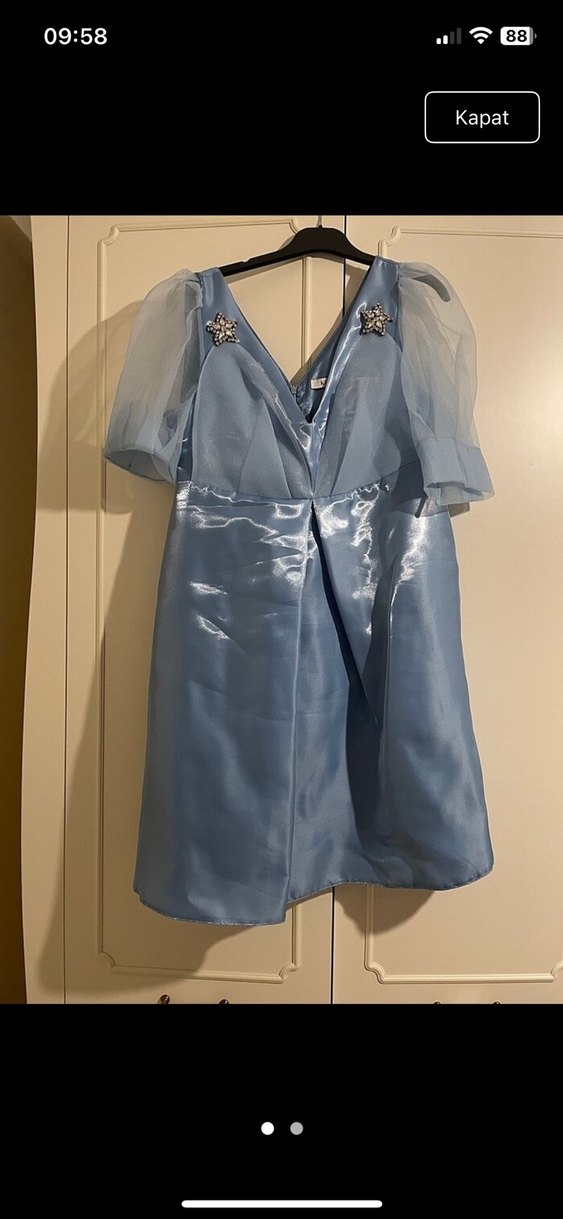 Parlak mavi midi boy elbise, V yaka ve dökümlü tasarıma sahip. İp detaylı yarı transparan kollu, rahat kesim, şık ve zarif görünüme sahip.