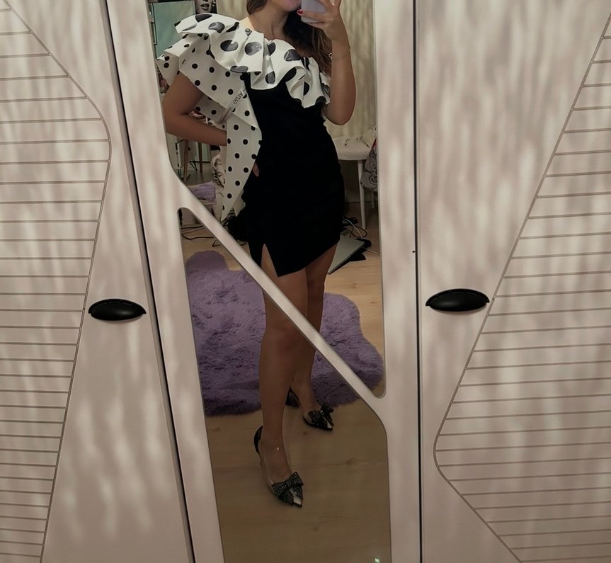 Gizia orijinal Siyah mini elbise, straplez yakalı ve puantiyeli volan detaylıdır. Sentetik kumaştan yapılmış, parti için uygundur.