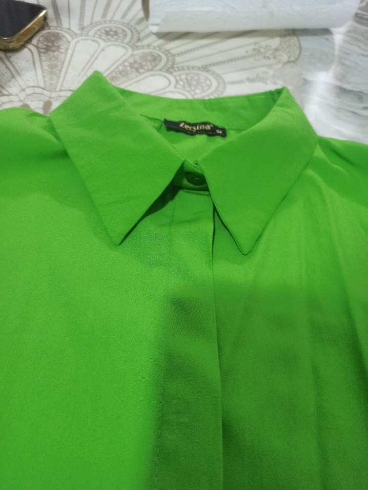 Düğmeli, yakalı ve uzun kollu kadın gömleği, ipeksi kumaştan ve normal kesimde, canlı yeşil renkte günlük kullanım için uygundur. (hiç kullanılmamıştır)