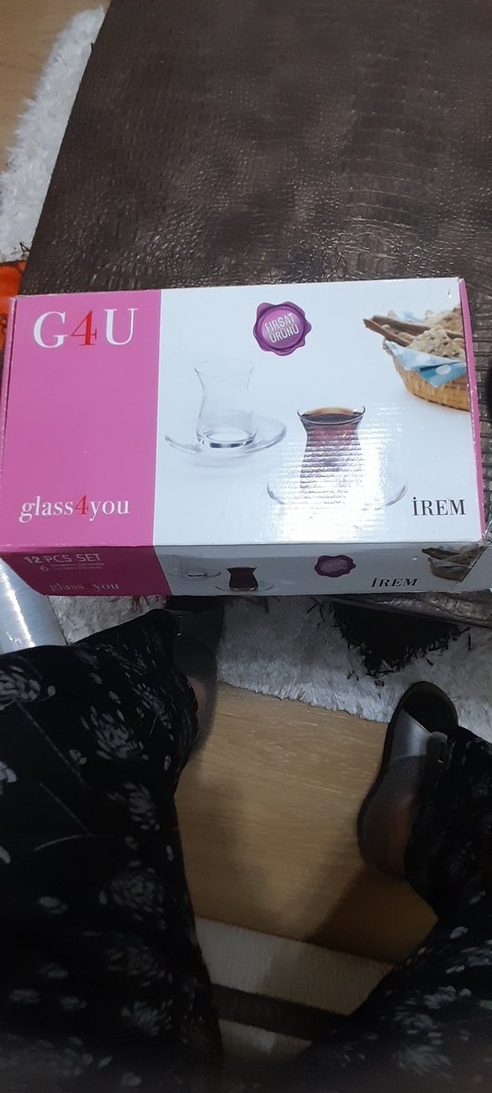 Glass4You markalı 12 parçadan oluşan çay takımı, cam fincanlar ve tabaklardan oluşur. IREM logosu bulunur, kutusu pembe renklidir.