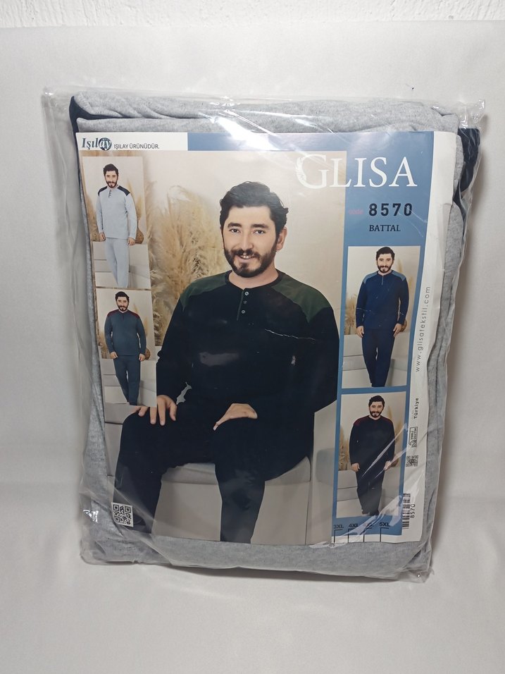 GLISA markalı erkek pijama takımı, gri renkli, baskılı desenli, uzun kollu ve bisiklet yaka. Rahat kesim ve midi boyda, günlük sokak stili.