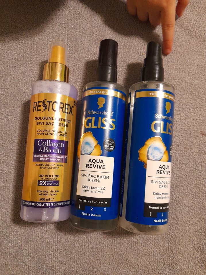 Gliss Aqua Revive sıvı saç bakım kremleri normal ve kuru saçlar için kolay tarama ve nemlendirme sağlar. Restorex kolajen ve biotin içeren dolgunlaştırıcı sprey ekstra hacim ve parlaklık verir. Her biri 200 ml şişede. kullanilmistir. mavi sisenin bir tanesi dolu digerinde az kalmistir. restirex te doludur. doluluk yerini parmagimla gosterdim. toplam fiyattir