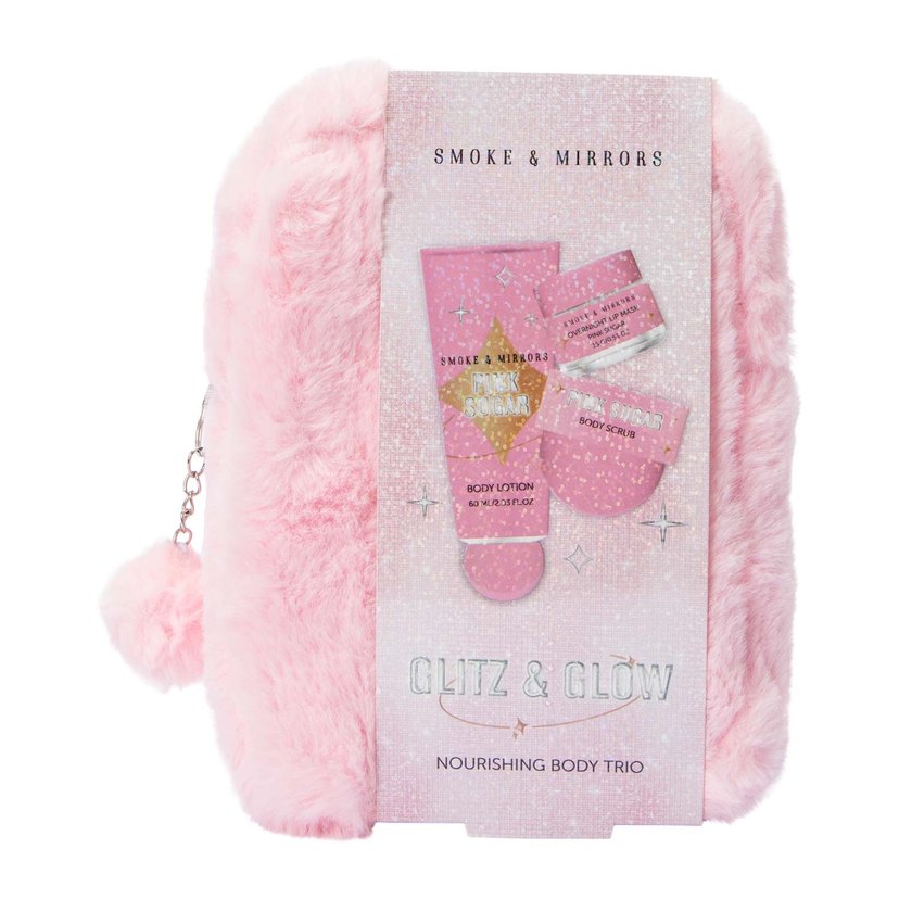 Bu ürün, "Smoke & Mirrors Glitz & Glow Nourishing Body Trio" setidir. Set, pembe renkli, yumuşak, tüylü bir çantanın içinde sunulmaktadır. Ürün, "Pink Sugar" serisine ait bir vücut losyonu (60 mL / 2.03 FL.OZ), bir vücut peelingi ve bir dudak maskesi içermektedir. ✨