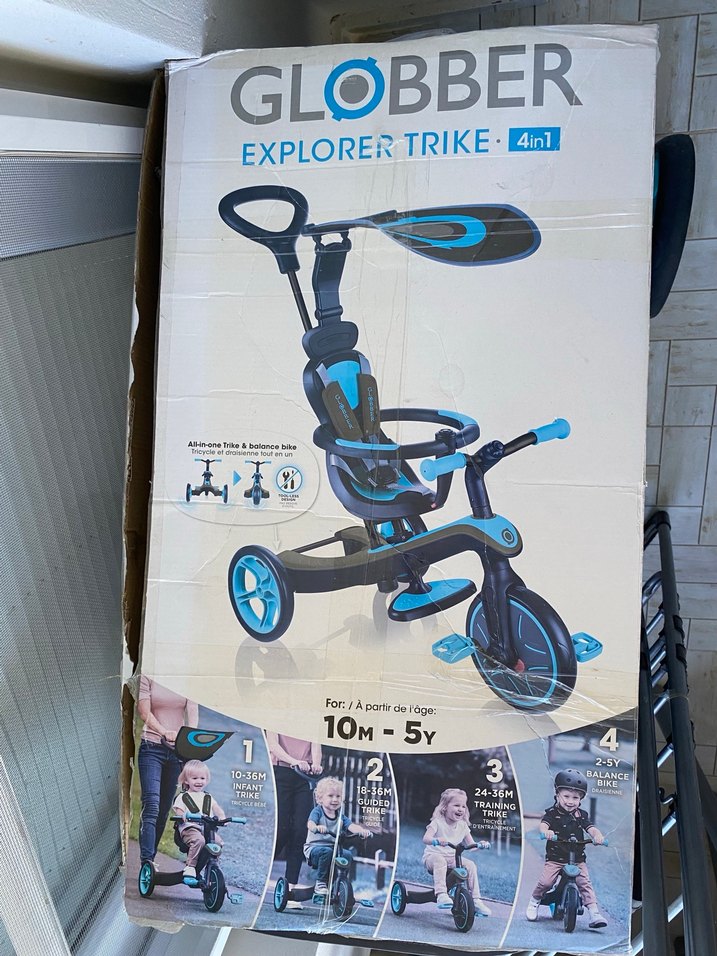 Globber Explorer Trike, 10 ay-5 yaş arası çocuklar için 4'ü 1 arada mavi üç tekerlekli bisiklettir. Çok iyi durumda az kullanılmış. Ayarlanabilir tutma kolu ve güvenlik koltuğu bulunur. Tüm malzemeleri tamdır. Yer: Mersin Üniversitesi