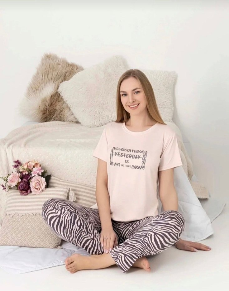 Geçmiş yazılı kısa kollu pembe üst ve zebra desenli bol pantolonlu rahat kadın pijama takımı.