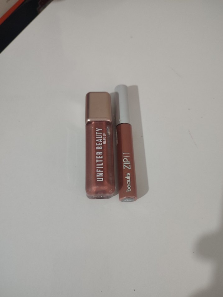 Parlak bej tonlarında, dudaklara pürüzsüz ve parlak bir görünüm veren iki ruj seti.