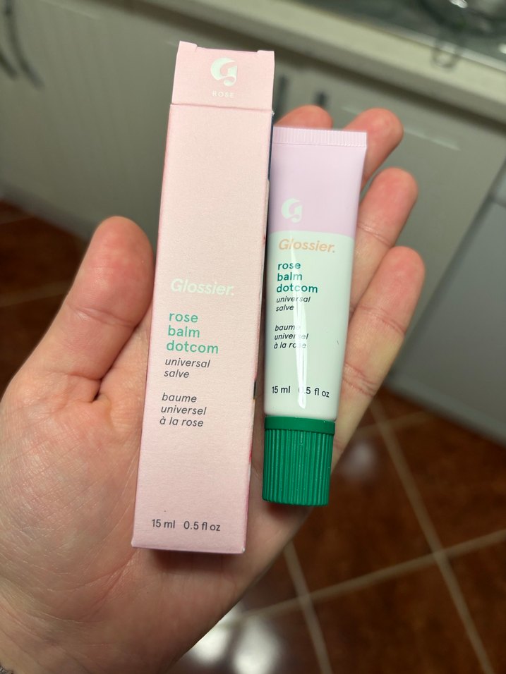 Glossier Rose Balm Dotcom, 15 ml tüpte pastel pembe evrensel dudak balsamıdır, nazik nemlendirme ve parlaklık sağlar.