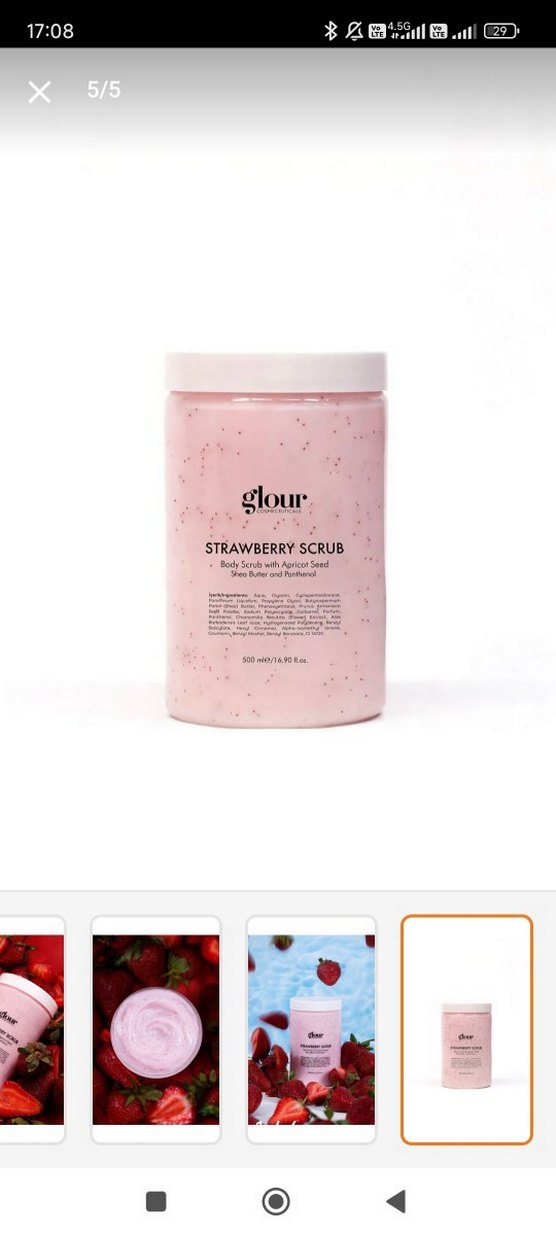 Glour Çilek Vücut Peelingi, kayısı çekirdeği, shea yağı ve parfüm içerir. Cildi pürüzsüzleştirir. 2 defa kullandım. #krem #bakımkremi #selülitkremi #çileközlükrem #glour