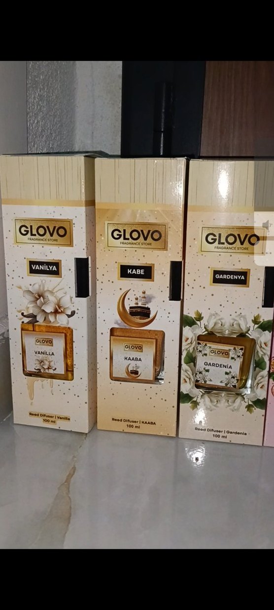 Glovo reed diffuserlar, 100 ml şişede vanilya, Kabe ve gardenya olmak üzere çeşitli koku seçeneği sunar.