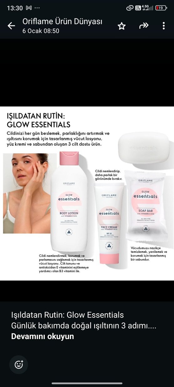 Glow Essentials set, vücut losyonu, yüz kremi ve sabundan oluşur. Cildi besler, parlaklığını artırır ve B3 vitamini ile korur.