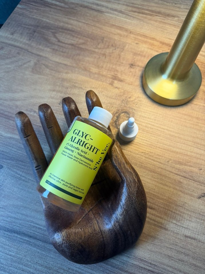 GLYC-ALRIGHT toneri %5 glikolik asit ve niasinamid içerir, cildi nazikçe eksfoliye eder ve aydınlatır. Beyaz kapaklı, ahşap el üzerinde sunulmuştur. Ürün sıfır hiç kullanılmadı Orjinaldir.