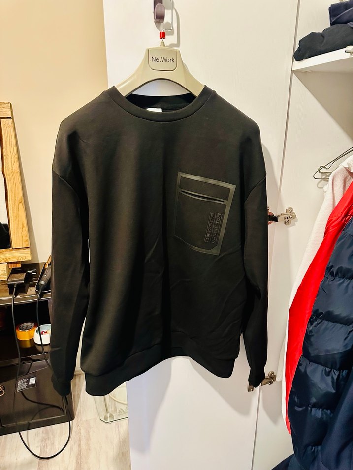 Siyah, yuvarlak yaka ve uzun kollu erkek sweatshirtü, rahat kesim ve göğüs cebine sahip. Yumuşak ve sıcak kumaştan, günlük kullanım için uygun.