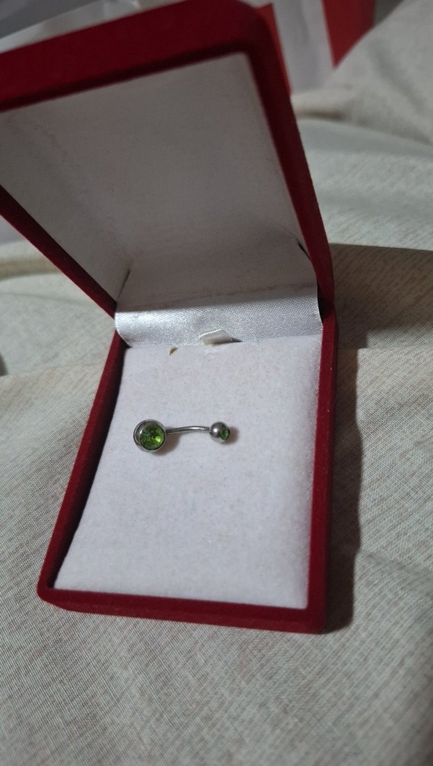 Yeşil renkli, düğmeli göbek piercing. Minimalist ve klasik zarafeti yansıtır.