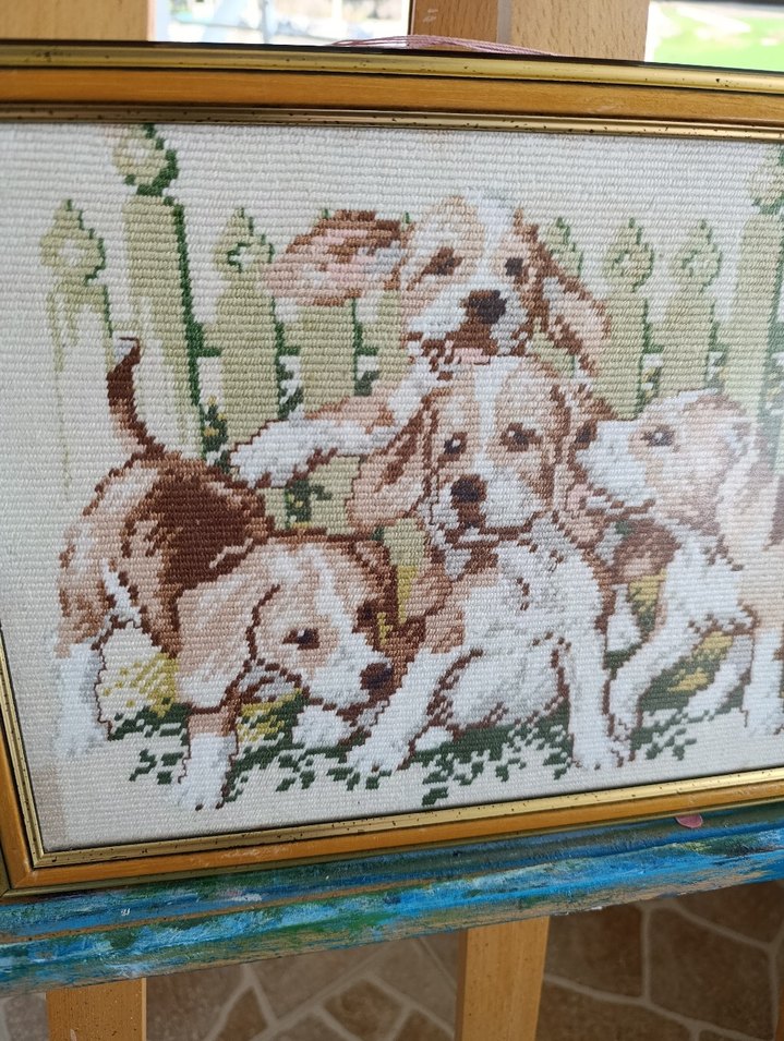 Çerçeveli nakış tablo, açık yeşil çit önünde dört kahverengi ve beyaz yavru köpeği gösterir, sevimli ve zarif bir sahne oluşturur.