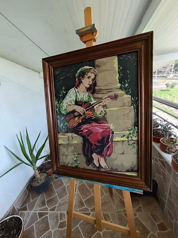 Kahverengi çerçeveli bu tabloda, taş yapının yanında oturan ve telli bir çalgı çalan kadın figürü yer alıyor. Koyu ve haki tonlar hakim.