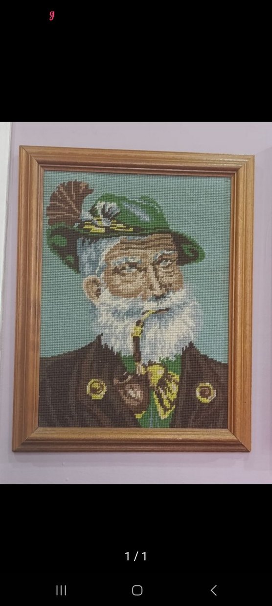 Çerçeveli, yeşil şapkalı, beyaz sakallı yaşlı adam figürlü nakış tablo. Koyu kahverengi tonlarda detaylı işçilik bulunur.