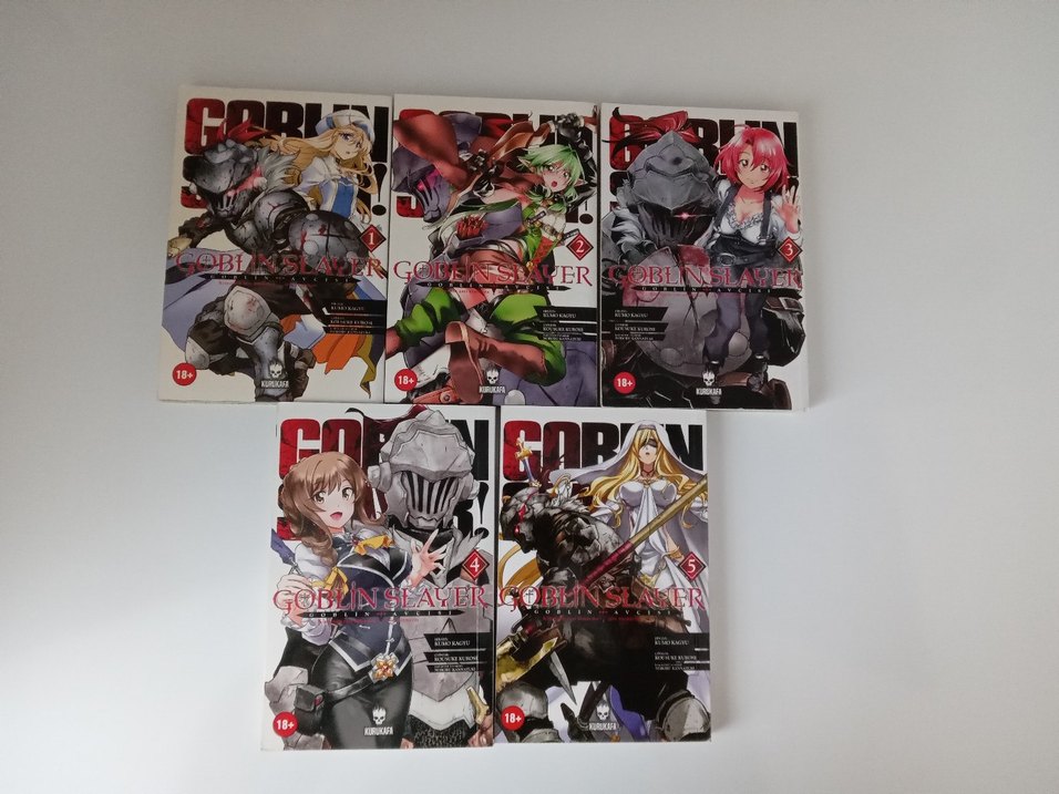 Goblin Slayer manga seti, karanlık fantezi temalı ve 18 yaş üstü etiketli beş ciltten oluşuyor. sararmalar vardır.
