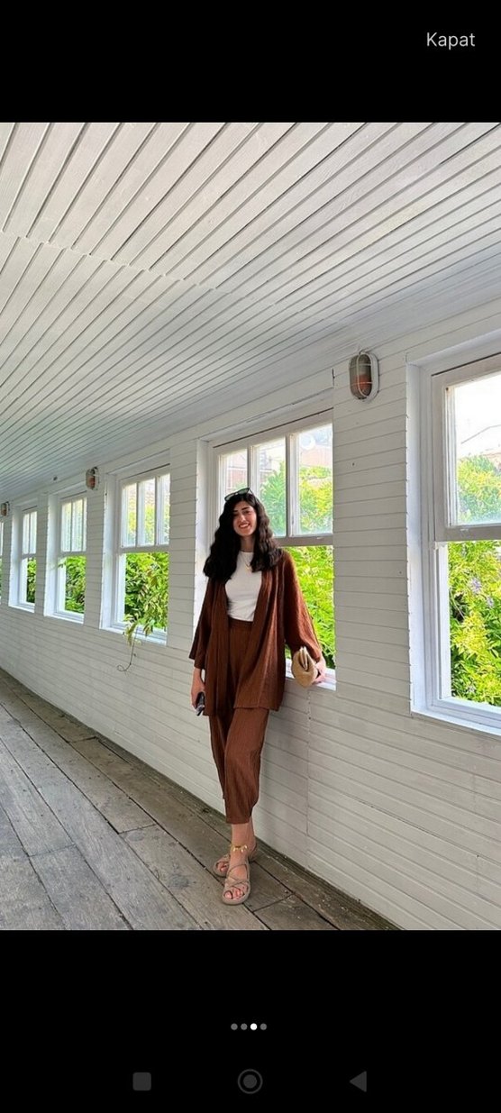 Drapeli, kahverengi, uzun kollu kadın takımı, notlu yaka ve ipeksi kumaştan, minimalist ve normcore tarzda günlük kullanım için uygundur.