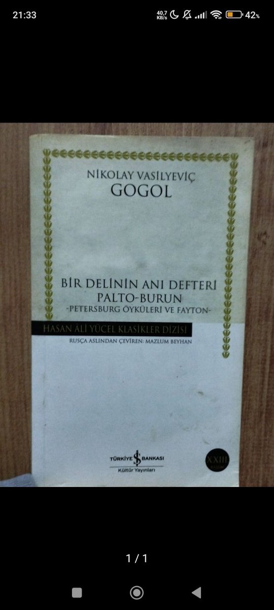 Nikolay Vasilyevic Gogol'un 'Bir Delinin Anı Defteri', 'Palto-Burun' ve Petersburg öykülerini içeren kitabı. Rusçadan Mazlum Beyhan tarafından çevrilmiştir.