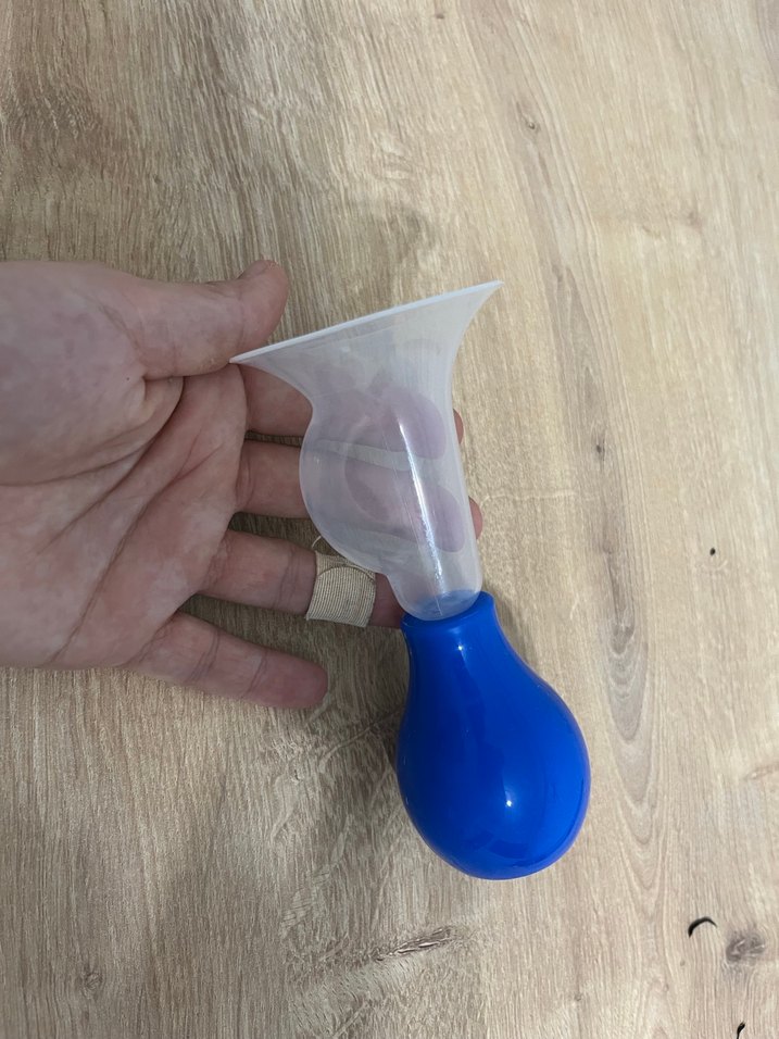 Mavi balon ve şeffaf emiş başlığına sahip göğüs pompası, süt sağımını kolaylaştırır. Elektrikli pompa kullandığım için çok az kullandım iyi durumda