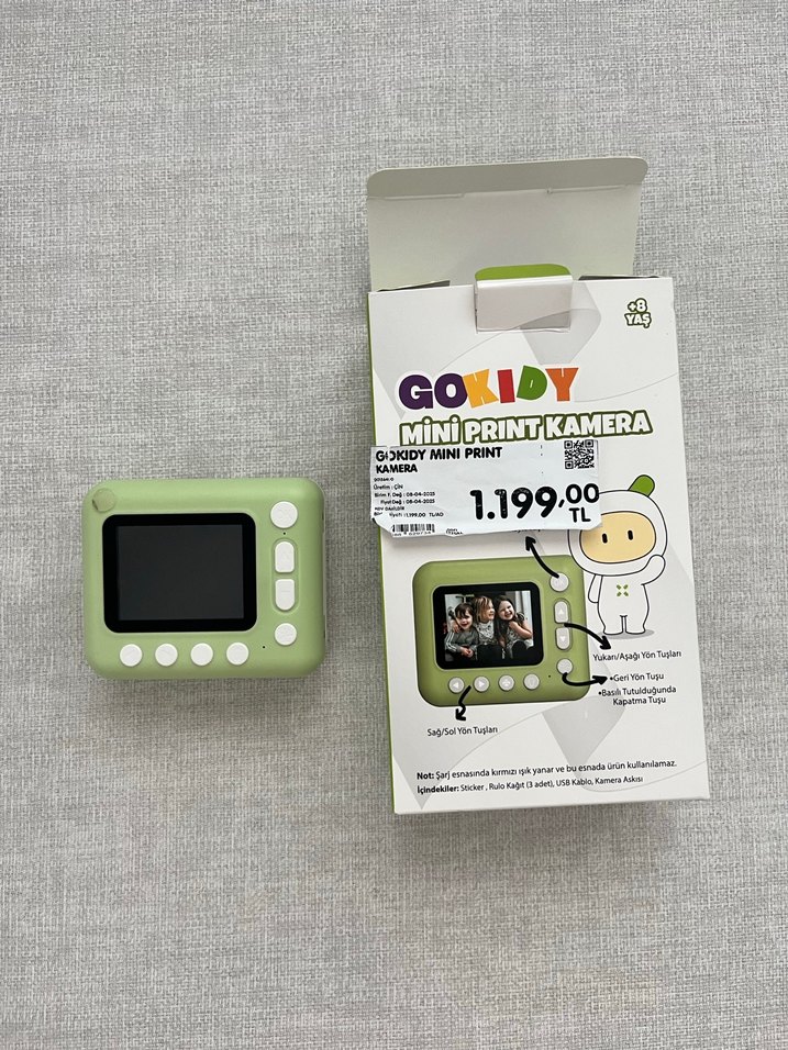Gokidy Mini Baskı Kamera, yeşil renkte, küçük ekran ve kolay kontrol düğmelerine sahip kompakt tasarımdadır.